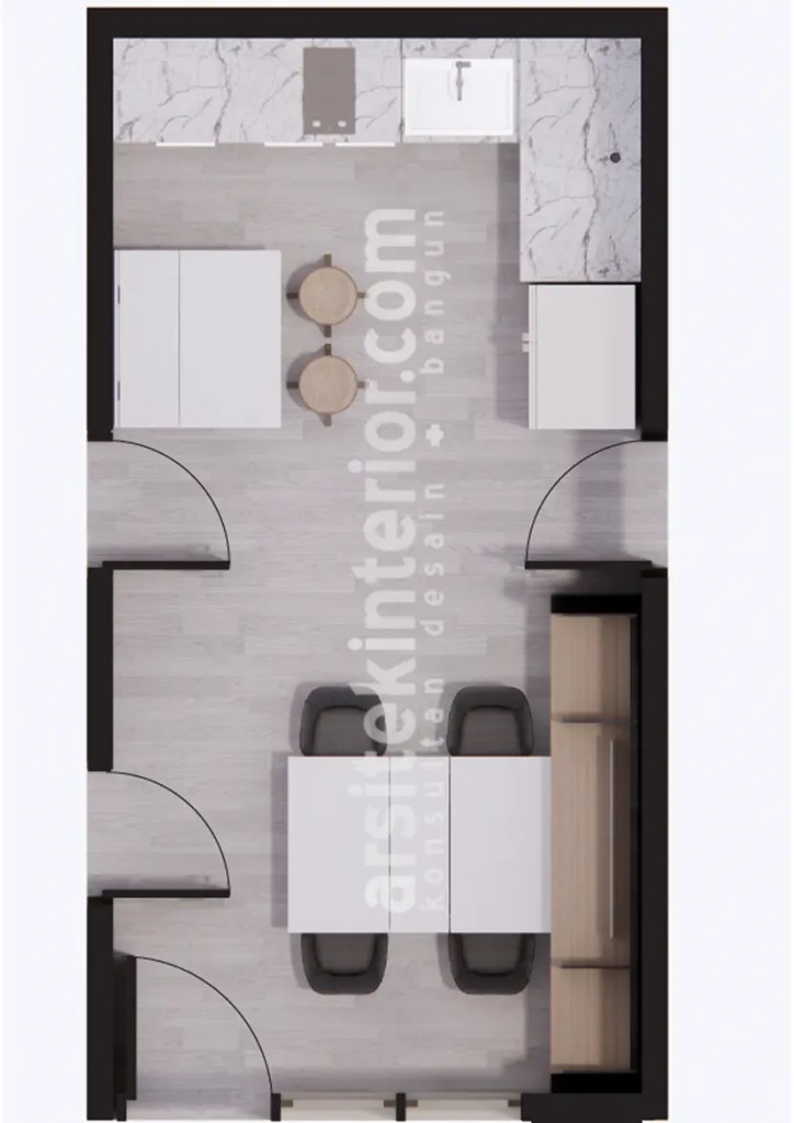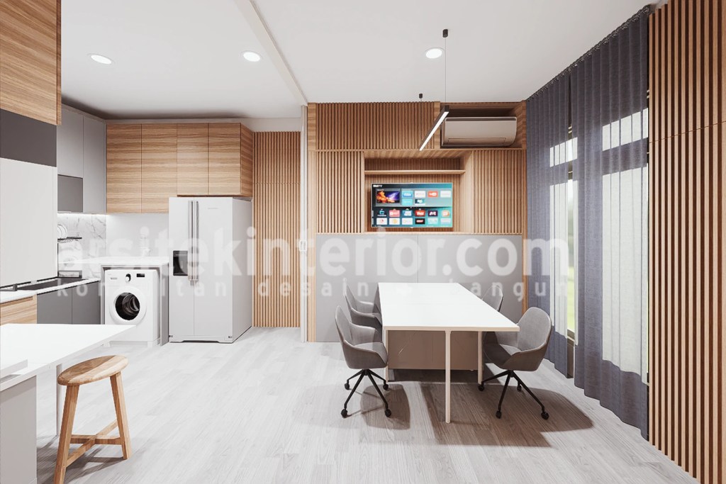Pada layout interior kantor minimalis, ruang tamu langsung terhubung tanpa sekat dengan area ruang makan dan dapur. Konsep open-plan ini memberikan kesan ruang yang luas dan lega. Meskipun keseluruhan ruang hanya berukuran 3 x 6 meter, ruang ini mampu mencakup fungsi sebagai ruang tamu, ruang makan, dan dapur sekaligus. Ditambah dengan ruang tamu yang dapat berganti fungsi sebagai ruang meeting menjadikan renovasi desain kantor interior ini memiliki nilai tambah.