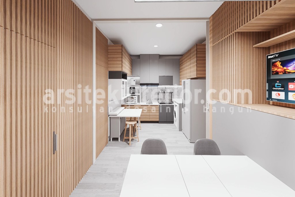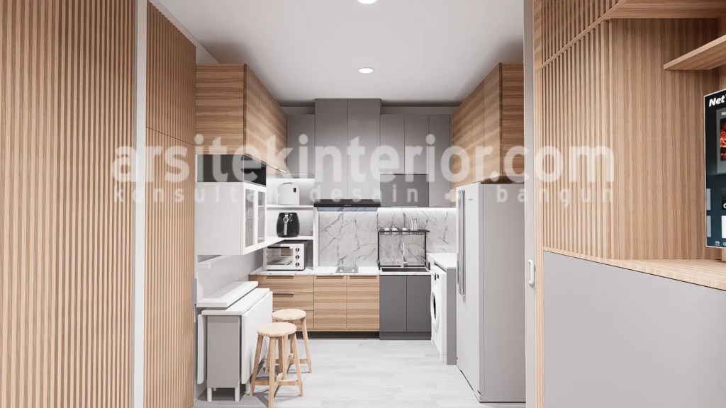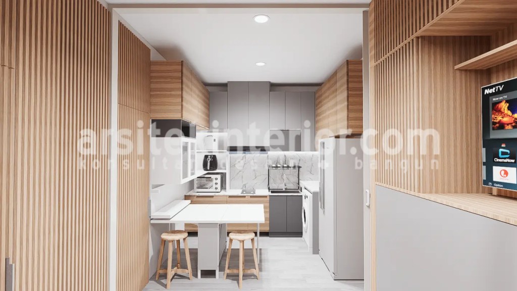 area dapur terintegrasi satu ruangan dengan ruang tamu. Terlepas dari keterbatasan ruang, desain ini sudah mencakup kabinet, ruang untuk mesin cuci, kompor, kitchen sink, mesin cuci dan meja untuk menyiapkan makanan yang memadai. Kehadiran mesin cuci pada area dapur juga menjadi bukti bahwa ruang ini benar-benar dirancang untuk gaya hidup multifungsi. Kabinet atas dan bawah diberikan finishing abu-abu dan tekstur kayu menciptakan tampilan yang rapi dan modern. Backsplash bermotif marmer putih menambah kesan mewah pada keseluruhan tampilan