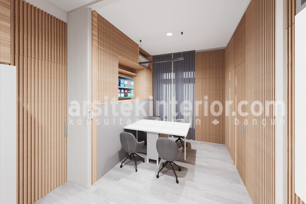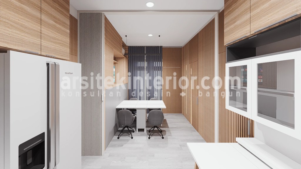 Pada desain kantor minimalis ini, digunakan wall penel kayu vertikal, di mana tidak hanya mempercantik tampilan ruangan, tetapi juga memberikan tekstur, visual yang terkesan hangat dan menyenangkan. material ini dipilih karena memberikan kontras lembut terhadap elemen lain seperti sofa dan kabunet dapur berwarna netral sehingga memberikan kesan yang seimbang dan nyaman.